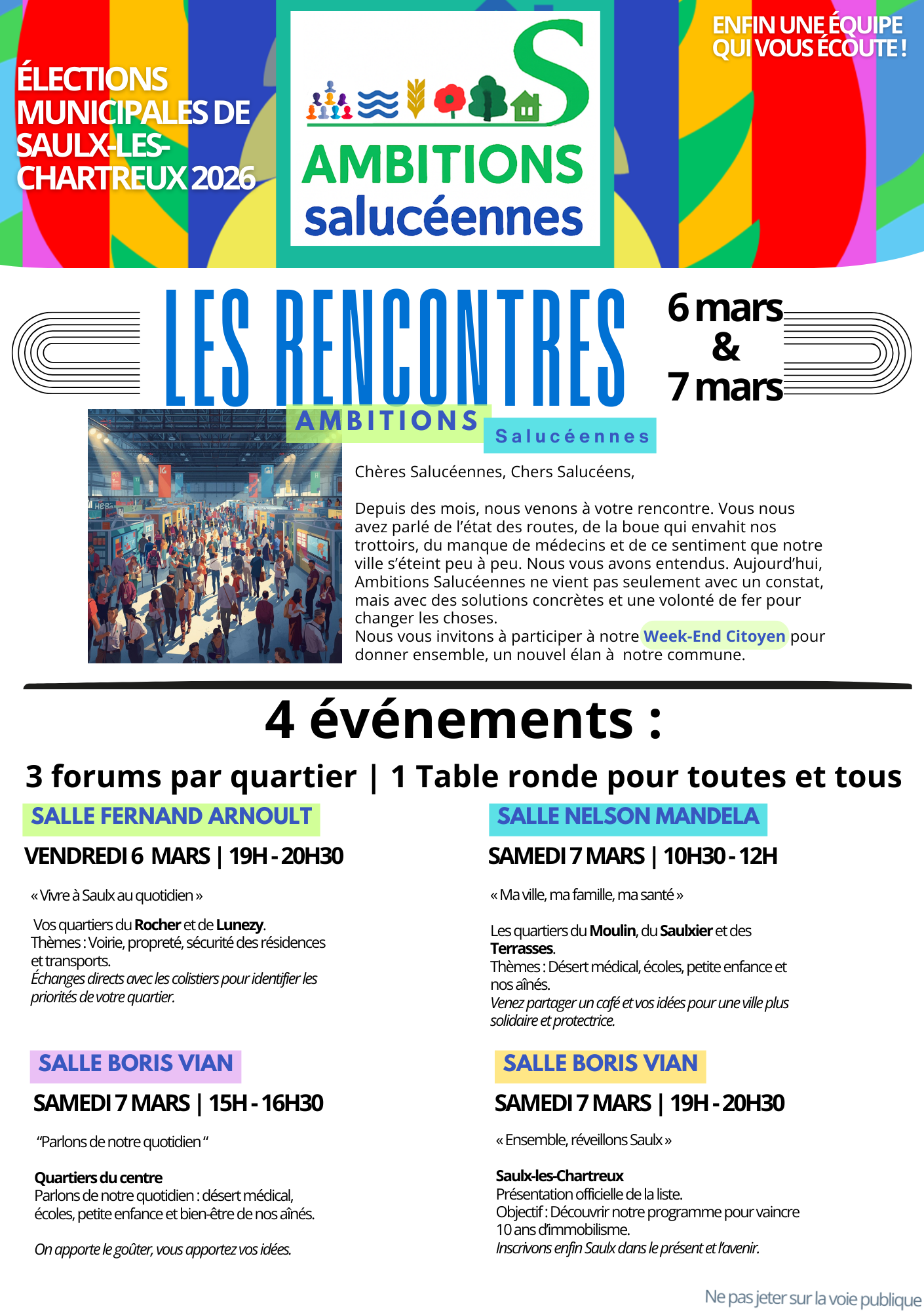 4 événements pour dialoguer, confronter nos idées et rencontrer les membres de la liste AMBITIONS Salucéennes qui se présentent devant les salucéennes et les salucéens à l'occasion des prochaines élections municipales.